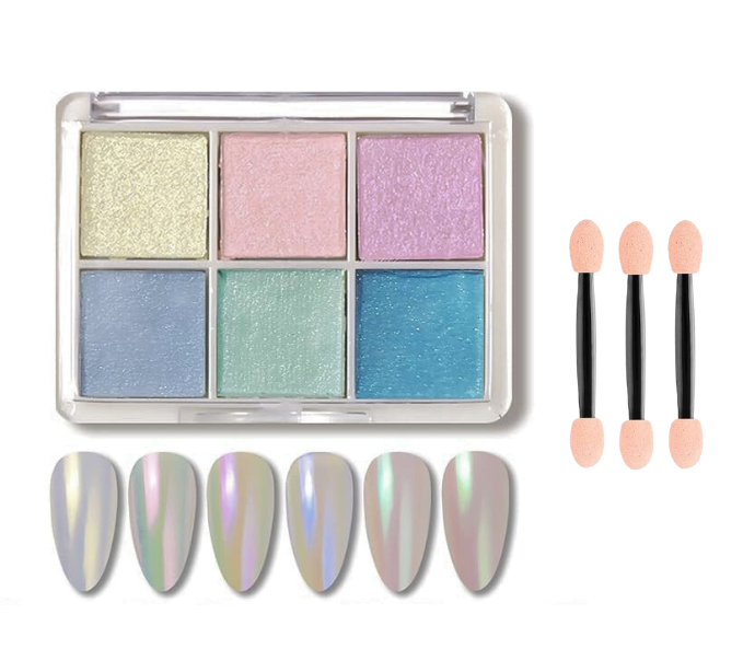Create stunning reflective nail designs with this 6-shade mirror powder palette. Each pressed pigment delivers a smooth, high-shine chrome finish, perfect for effortless gradient, holographic, and mirror-effect nail art.