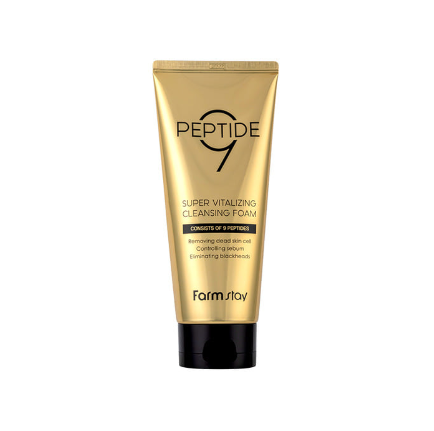 Brand: Farmstay / Volume: 180 ml / Key Ingredients: 9 peptide complexes (e.g., Copper Tripeptide-1, Acetyl Hexapeptide-8) / Skin Type: All skin types, especially those wanting cleansing + anti-aging care / Texture: Rich, foamy cleansing foam