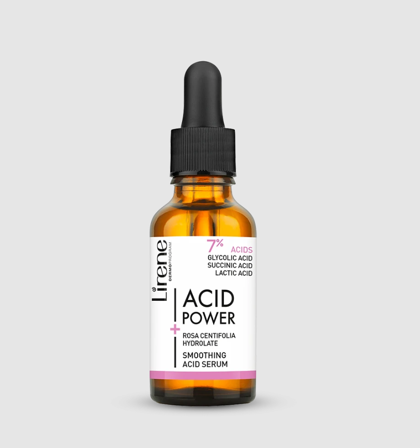Brand: Lirene / Volume: 30 ml / Key Ingredients: AHA acids (glycolic, lactic, succinic) 7%, Rosa Centifolia flower water 20% / Skin Type: All skin types, especially those with uneven texture or tone / Usage: Use on cleansed dry skin. Avoid eye area. Use sun-protection after.