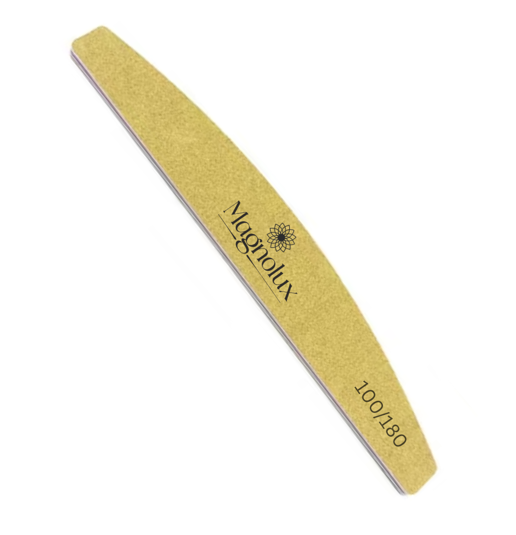 Brand: Magnolux / Type: Double-sided curved nail file / Grit: 100/180 / Color: Yellow / Material: High-quality abrasive surface with foam core / Use: Nail shaping, smoothing, and finishing / Features: Reusable, washable, disinfectable