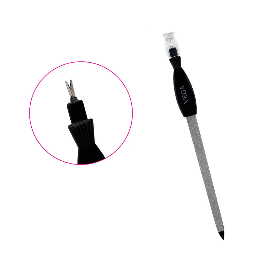 Shape, smooth, and clean your nails effortlessly with the Vega Metal Nail File. Designed with a dual-sided surface for filing and shaping, plus a built-in cuticle pusher and dirt remover for complete nail care.