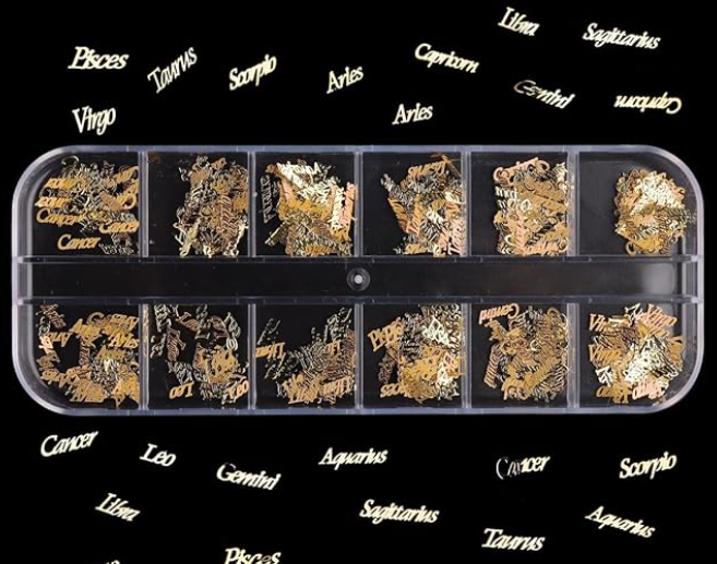 Enhance your manicures with zodiac-themed letter flakes featuring all twelve horoscope names. Perfect for personalized, astrology-inspired nail designs.